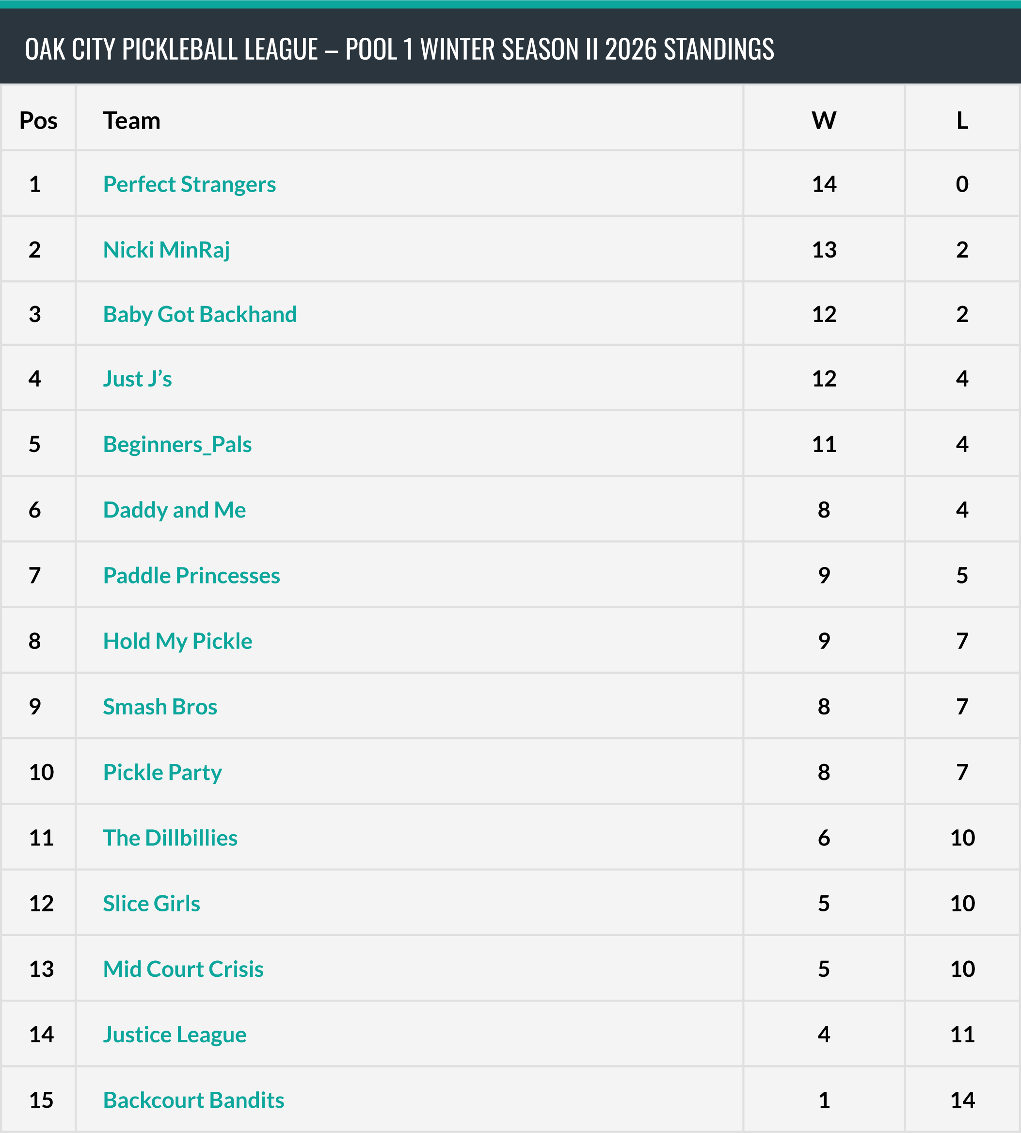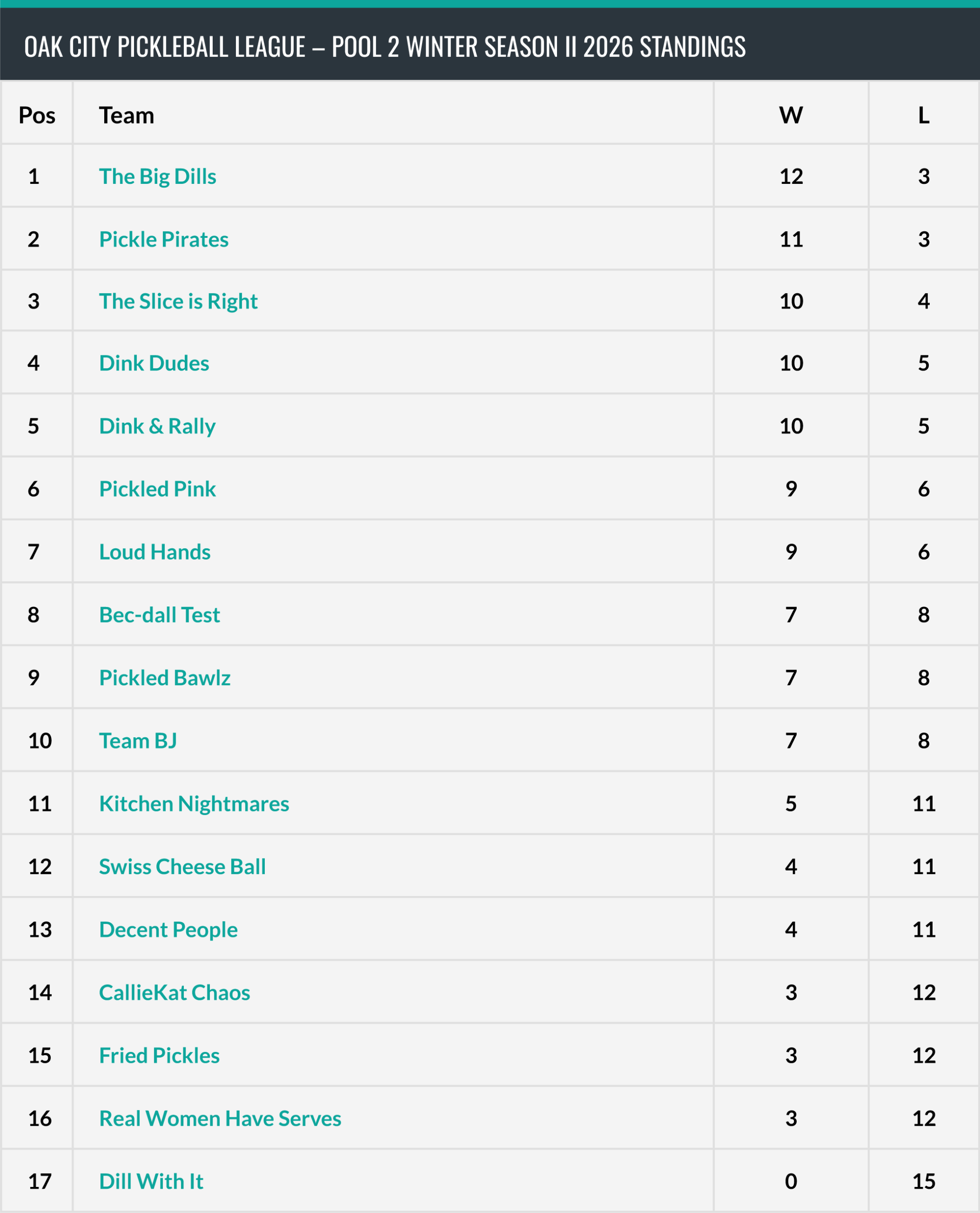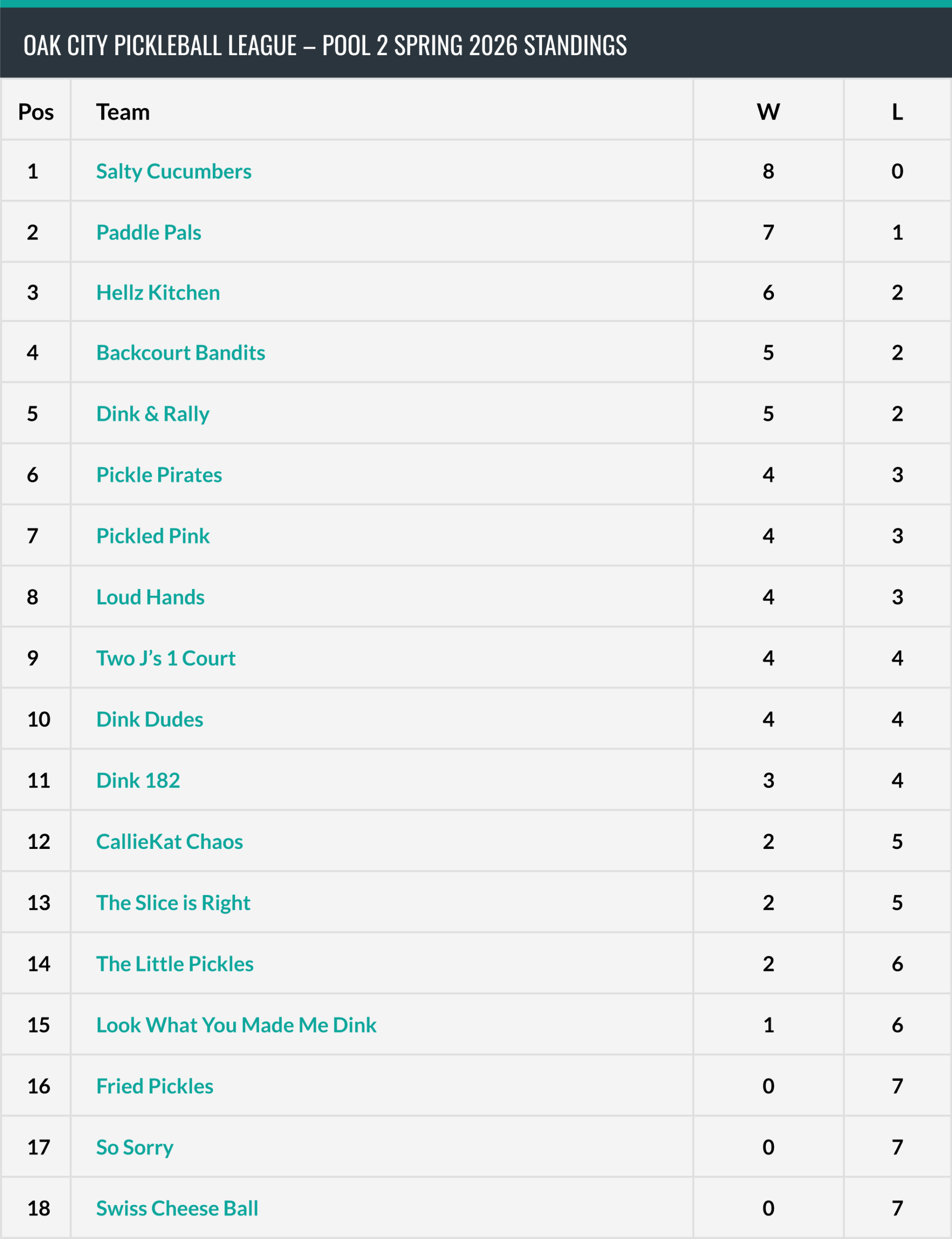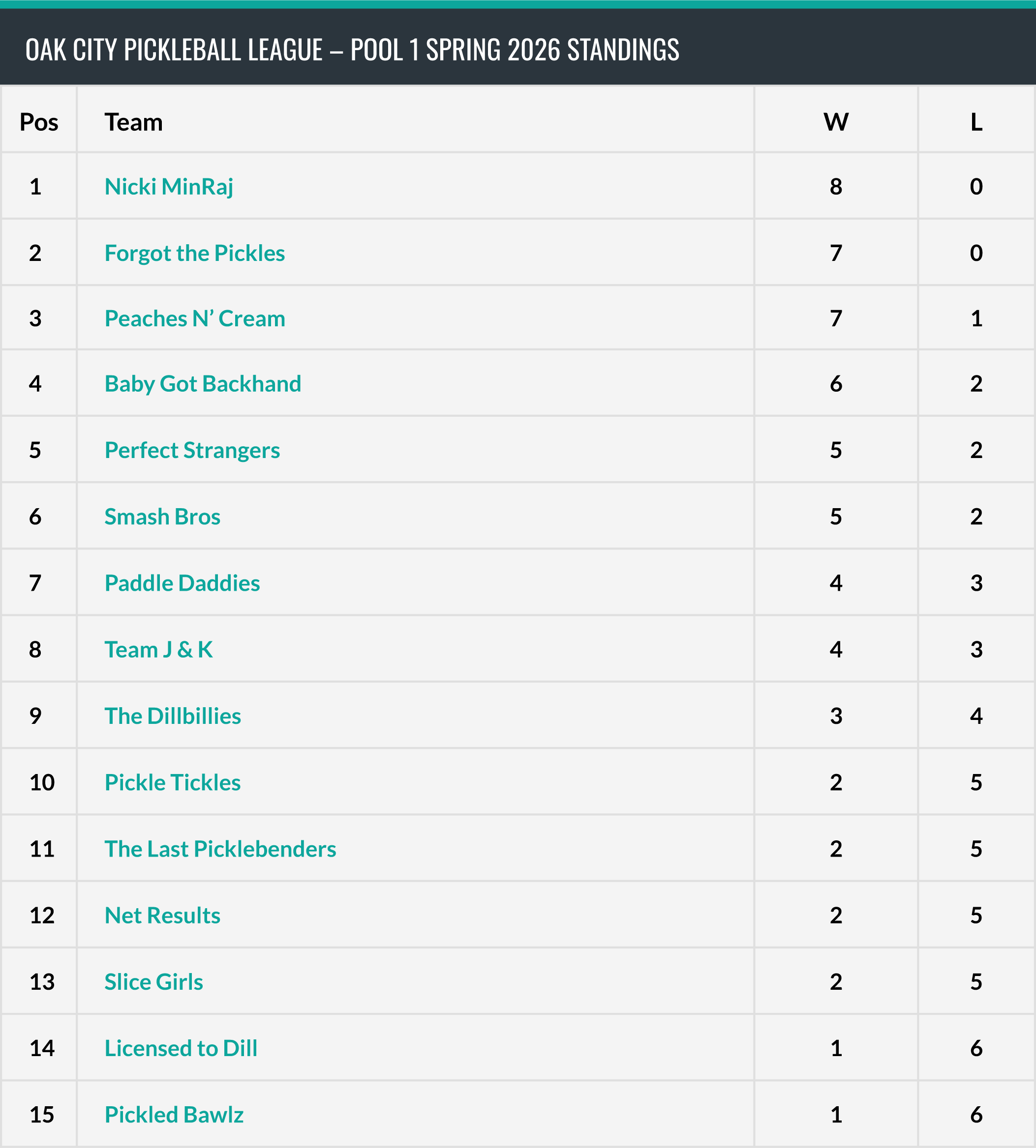 We began our second Winter season on February 9th and wrapped up on 3/23/26; we’d like to congratulate the winners of our season-ending single elimination tournament, Pool 1’s Perfect Strangers (lower left) and Pool 2’s The Big Dills (below right) – each team also won their pool’s regular season (Nicki MinRaj and Pickle Pirates were 2nd place in these pools, respectively)! Each team was awarded two $25 gift certificates to downtown Raleigh’s awesome Deco (the best place in town for unique gifts) – we’re ready to reset and get a new season going in a few weeks!